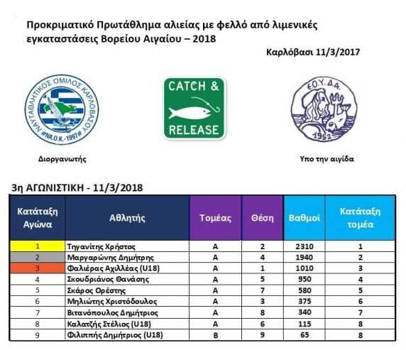 Πραγματοποιήθηκε χθες Κυριακή ο 3ος αγώνας αλιείας με φελλό από λιμενικές εγκαταστάσεις του Περιφερειακού Πρωταθλήματος Βορείου Αιγαίου,στο λιμάνι Καρλοβάσου.