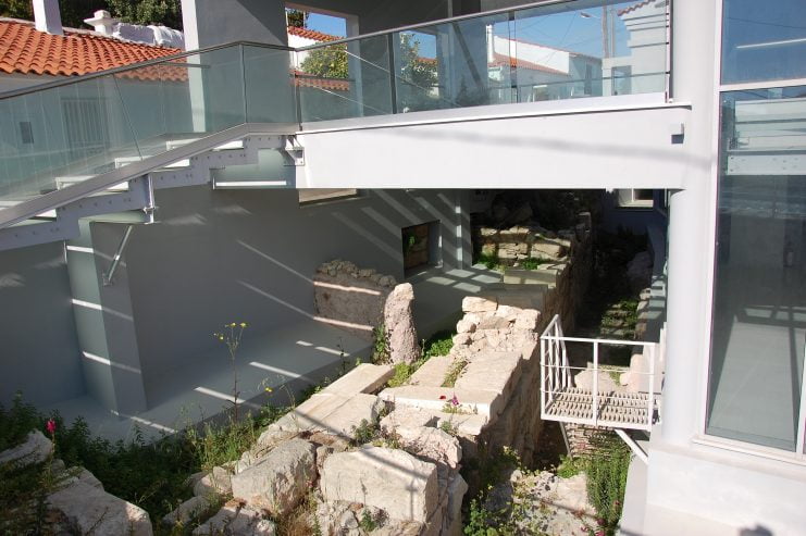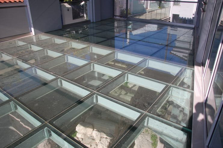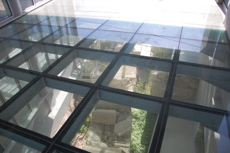 Στον επάνω όροφο,συνολικής έκτασης 400 τ.μ., ανεβαίνοντας τα γυάλινα σκαλιά για να εισέλθεις στο εσωτερικό του,φτάνεις σε ένα εντυπωσιακό γυάλινο δάπεδο που προσφέρει διαύγεια και επιτρέπει να δεις στο έπακρο τη θέα με τα ευρήματα της πρωτοβυζαντινής περιόδου που βρίσκονται ακριβώς κάτω απο τα πόδια σου!.