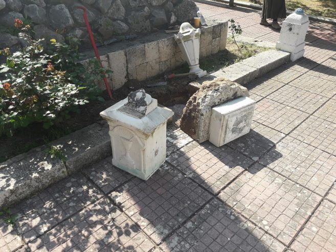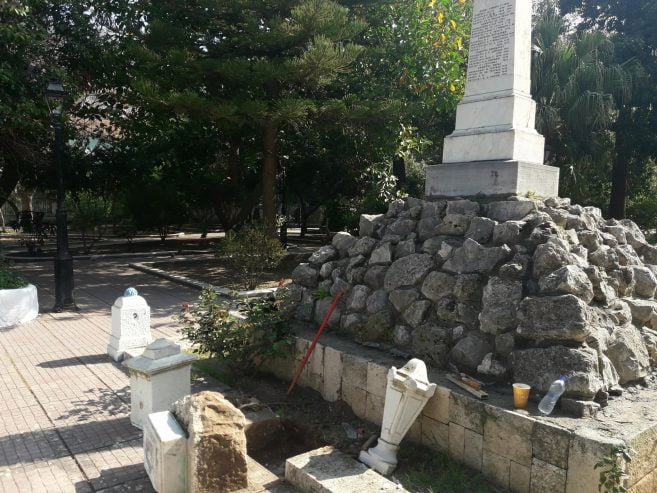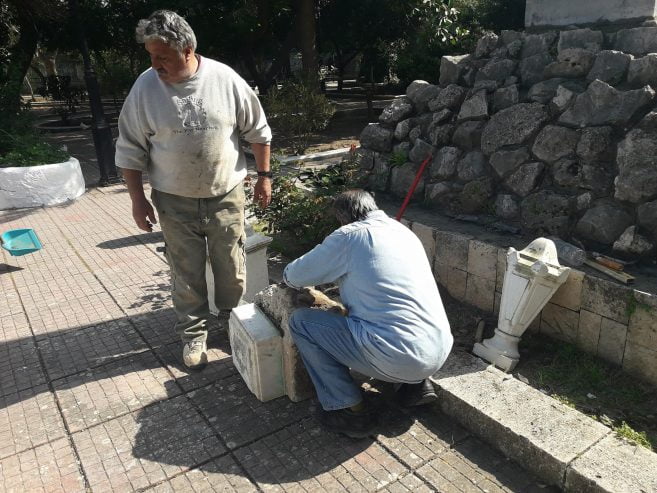 Από νωρίς το πρωί συνεργεία του δήμου Σάμου προσπαθούν να αποκαταστήσουν τις ζημιές, τοποθετώντας ξανά τα μαρμάρινα διακοσμητικά που χρονολογούνται τουλάχιστον 50 χρόνια στη θέση τους.