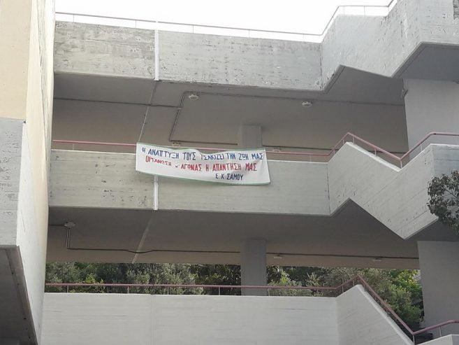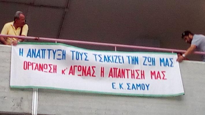 Μέλη του Εργατικού Κέντρου Σάμου, ανάρτησαν πανό στην πρόσοψη της Αντιπεριφέρειας Σάμου, με το οποίο αναφέρουν οτι :”Η ανάπτυξη τους τσακίζει την ζωή μας .Οργάνωση και αγώνας η απάντηση μας“.