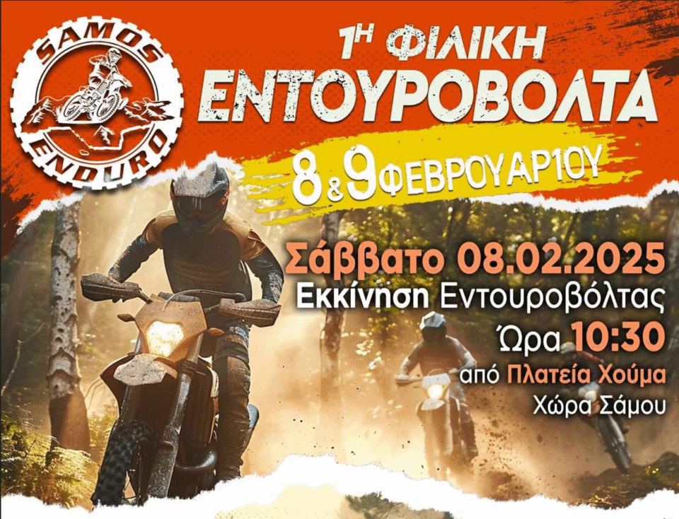 Το διήμερο 8-9 Φεβρουαρίου πρόκειται να πραγματοποιηθεί η 1η Φιλική Εντουροβόλτα στη Σάμο, μια διοργάνωση αφιερωμένη στους λάτρεις του μηχανοκίνητου αθλητισμού και της περιπέτειας.