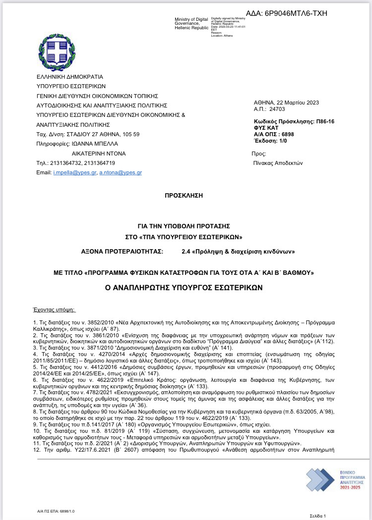 Δημοσιεύθηκε, σήμερα Πέμπτη, 23 Μαρτίου, η πρόσκληση για την υποβολή προτάσεων για την αποκατάσταση ζημιών από φυσικές καταστροφές στο Νομό μας, συνολικού ποσού 3.745.000 ευρώ, εκ των οπίων τα 3.425.000 αφορούν την αποκατάσταση των βλαβών στα σχολεία.