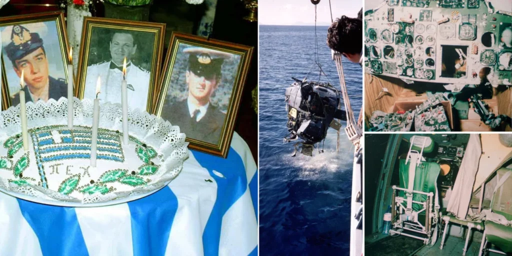 04:50 Το πλήρωμα του ελικοπτέρου αναφέρει ότι εντόπισε περί τους 10 Τούρκους κομάντος με τη σημαία τους. Δίνεται εντολή να επιστρέψει στη βάση του κι ενώ πετά μεταξύ των βραχονησίδων Πίτα και Καλόλιμνος αναφέρει βλάβη και χάνεται από τα ραντάρ. Αργότερα θα ανασυρθούν νεκρά και τα τρία μέλη του πληρώματος, ο υποπλοίαρχος Χριστόδουλος Καραθανάσης, ο υποπλοίαρχος Παναγιώτης Βλαχάκος και ο αρχικελευστής Έκτορας Γιαλοψός, σκοτώθηκαν. Σχετικά με τις αιτίες πτώσης του ελικοπτέρου έχουν διατυπωθεί διάφορες απόψεις. Η επίσημη άποψη του ελληνικού κράτους ήταν ότι το σκάφος κατέπεσε λόγω κακοκαιρίας και απώλειας προσανατολισμού του πιλότου. Ωστόσο, στην Ελλάδα υπάρχει ευρέως διαδεδομένη η άποψη ότι το ελικόπτερο καταρρίφθηκε είτε από το Τουρκικό Ναυτικό είτε από τους Τούρκους καταδρομείς που υπήρχαν πάνω στο νησί και ότι το γεγονός αποκρύφθηκε, προκειμένου να λήξει η κρίση και να μην οδηγηθούν οι δύο χώρες σε γενικευμένη σύρραξη ή ακόμα και σε πόλεμο.