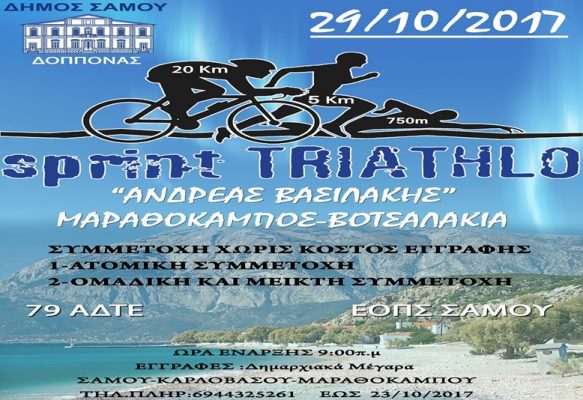 Ο ΔΟΠΟΝΑΣ διοργανώνει αγώνες σε συνεργασία με την 79 ΑΔΤΕ και τον ΕΟΠΣ Σάμου με την ονομασία “Sprint Triathlo Ανδρέας Βασιλάκης” ,την Κυριακή 29 Οκτωβρίου 2017 στην περιοχή Βοτσαλάκια Μαραθοκάμπου Σάμου.Οι αγώνες (750Μ Κολύμπι -20ΚΜ Ποδήλατο-5ΚΜ. Τρέξιμο) θα είναι χωρίς κόστος συμμετοχής.