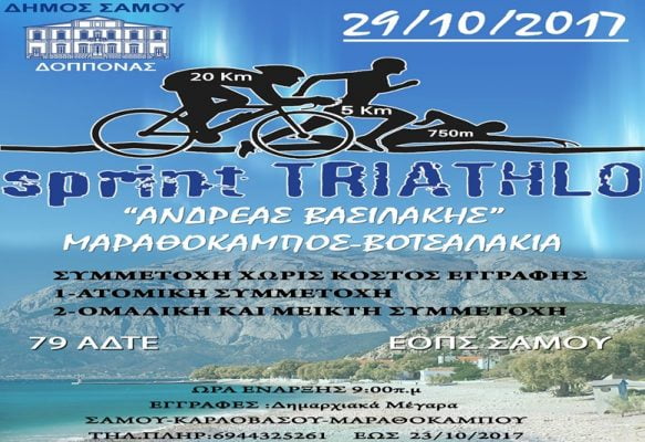 Ο ΔΟΠΟΝΑΣ  διοργανώνει αγώνες σε συνεργασία με την 79 ΑΔΤΕ και τον ΕΟΠΣ Σάμου με την ονομασία “Sprint  Triathlo Ανδρέας Βασιλάκης” ,την Κυριακή 29 Οκτωβρίου 2017 στην περιοχή Βοτσαλάκια Μαραθοκάμπου Σάμου.Οι αγώνες (750Μ Κολύμπι -20ΚΜ Ποδήλατο-5ΚΜ. Τρέξιμο) θα είναι χωρίς κόστος συμμετοχής.
