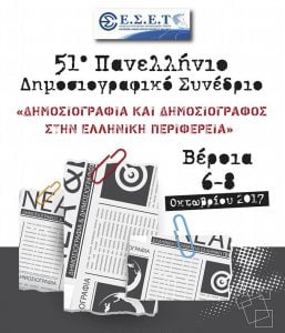 Η Ένωση Συντακτών Επαρχιακού Τύπου (Ε.Σ.Ε.Τ.) διοργανώνει το 51ο Πανελλήνιο Δημοσιογραφικό Συνέδριο της, στην Βέροια 6 – 8 Οκτωβρίου 2017 με θέμα «Δημοσιογραφία και Δημοσιογράφος στην Ελληνική Περιφέρεια»