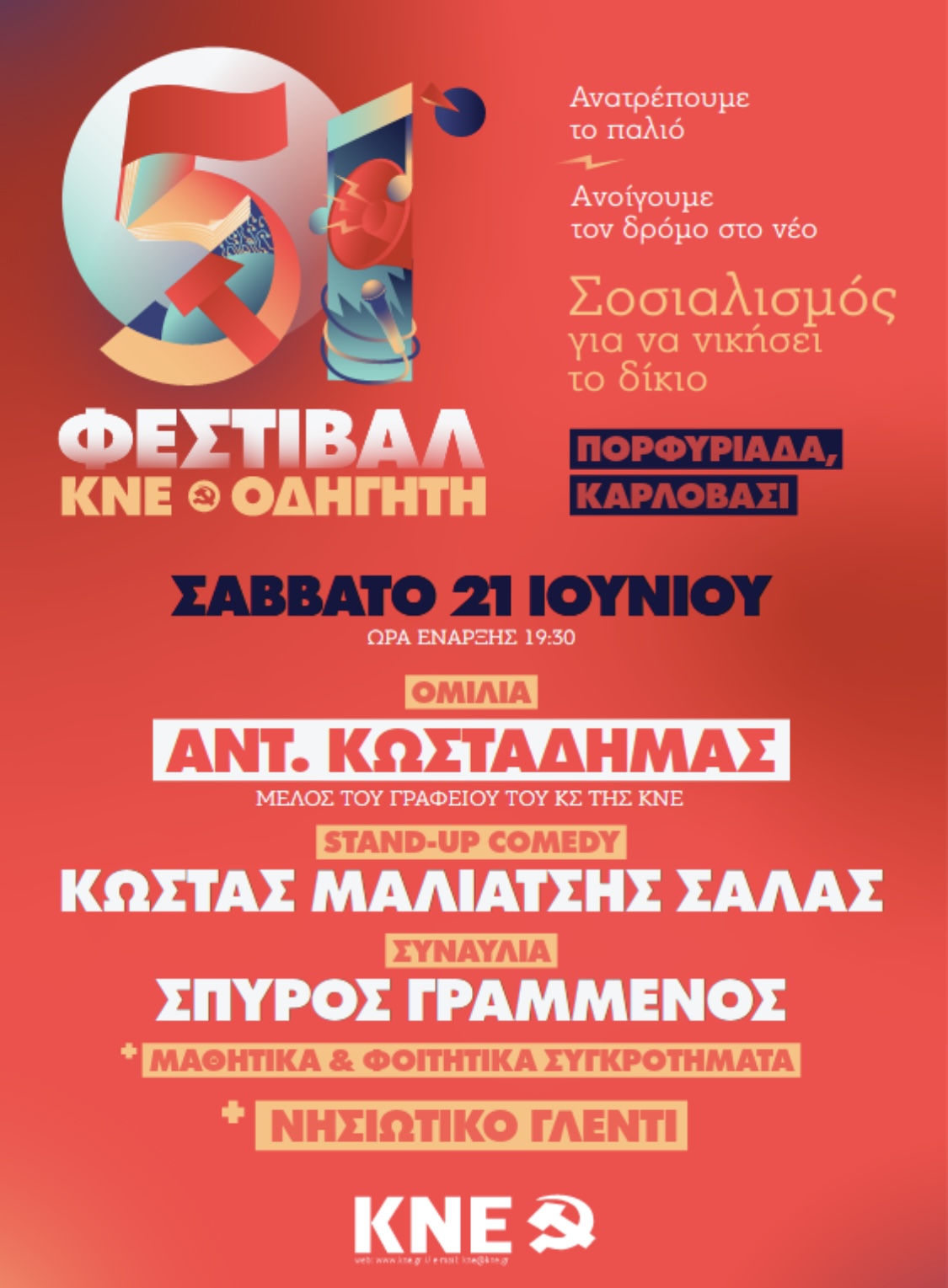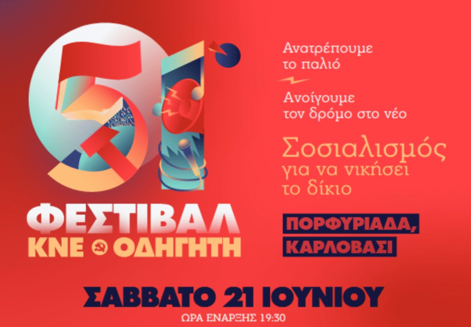 Με σύνθημα «Ανατρέπουμε το παλιό, ανοίγουμε τον δρόμο στο νέο. Σοσιαλισμός για να νικήσει το δίκιο!», το 51ο Φεστιβάλ ΚΝΕ – «Οδηγητή» έρχεται στο Καρλόβασι το Σάββατο 21 Ιουνίου, στην Πορφυριάδα Σχολή, υποσχόμενο μια βραδιά γεμάτη πολιτικό λόγο, μουσική και ψυχαγωγία.
