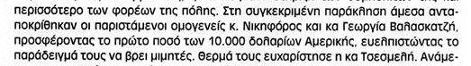 “Θέλουμε να ευχαριστήσουμε τον κο Νικηφόρο και την κα Γεωργία Βαλασκατζή για το ποσό των 10.000 ευρώ που πρόσφεραν για την ανακαίνιση της Φιλαρμονικής μας. Ευελπιστούμε το παράδειγμά τους να το μιμηθούν κι άλλοι συμπολίτες μας.