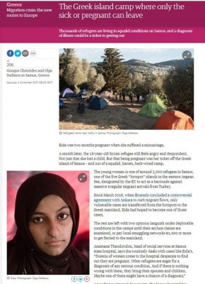 «Η Εϊντά ήταν δύο μηνών έγκυος όταν απέβαλε. Ένα μήνα αργότερα, η 18χρονη Σύρια αισθάνεται ακόμη θυμωμένη και μελαγχολική. Όχι μόνο επειδή έχασε ένα παιδί. Αλλά και γιατί αυτό το παιδί ήταν το “εισιτήριό” της για να φύγει από το ελληνικό νησί της Σάμου, όπου έμενε σε ένα άτακτο, άγονο και περιφραγμένο στρατόπεδο» υπογραμμίζεται στο άρθρο.