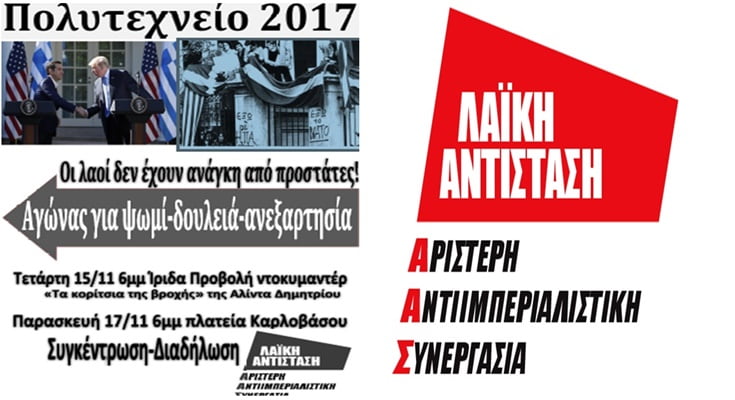 Η  Λαϊκή Αντίσταση- Αριστερή Αντιιμπεριαλιστική Συνεργασία Σάμου με αφορμή την συμπλήρωση 44 ετών απ’ την εξέγερση του Πολυτεχνείου, καλεί τον  λαό και  την νεολαία της Σάμου να συμμετέχουν μαζικά στις εκδηλώσεις που θα πραγματοποιήσει στο Καρλόβασι. Την στιγμή που η εξάρτηση της χώρας απ’ τους ιμπεριαλιστές ΗΠΑ-ΝΑΤΟ-ΕΕ μεγαλώνει όλο και περισσότερο, με τις συμφωνίες Τσίπρα- Τραμπ  για νέες βάσεις και την 3η αξιολόγηση να φέρνει στο προσκήνιο τα 95 νέα προαπαιτούμενα, ο αντιιμπεριαλιστικός αγώνας των εξεγερμένων του Πολυτεχνείου δείχνει τον δρόμο της πάλης που πρέπει να ακολουθήσει ο λαός και η νεολαία. Με οδηγό τον Νοέμβρη του 73, η απάντηση πρέπει να είναι ένα μαζικό λαϊκό μέτωπο  ενάντια στην εμπλοκή της χώρας στα σχέδια των ιμπεριαλιστών, που σήμερα (14/11) επισκέφτηκαν δια μέσου της επιτετραμμένης της αμερικάνικης πρεσβεία, κας Μπερνς , το νησί της Σάμου, προωθώντας τα συμφέροντά τους, συμφέροντα ενάντια σ’ εκείνα του λαού μας και των  λαών της περιοχής.