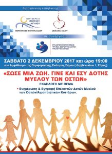 Η Περιφερειακή Ενότητα Σάμου και το Τμήμα Αιμοδοσίας Σάμου σε συνεργασία με τον Σύλλογο «Όραμα Ελπίδας» διοργανώνουν την εκδήλωση «Σώσε μια ζωή. Γίνε και εσύ εθελοντής δότης μυελού των οστών», το Σάββατο 2 Δεκεμβρίου 2017 στις 19.00 στο Αμφιθέατρο της ΠΕ Σάμου προκειμένου οι πολίτες να ενημερωθούν και να ευαισθητοποιηθούν σχετικά με τη δωρεά μυελού των οστών.