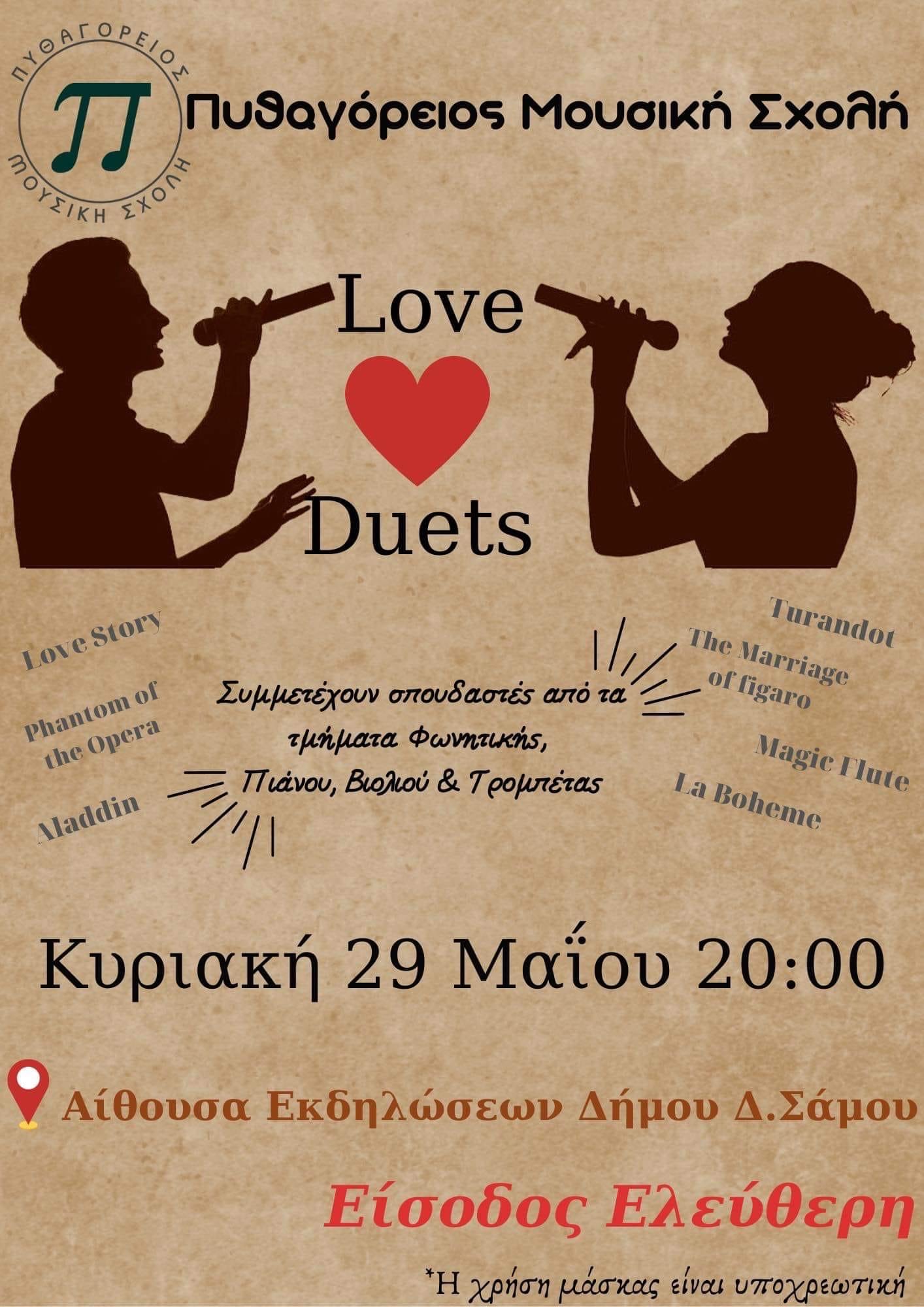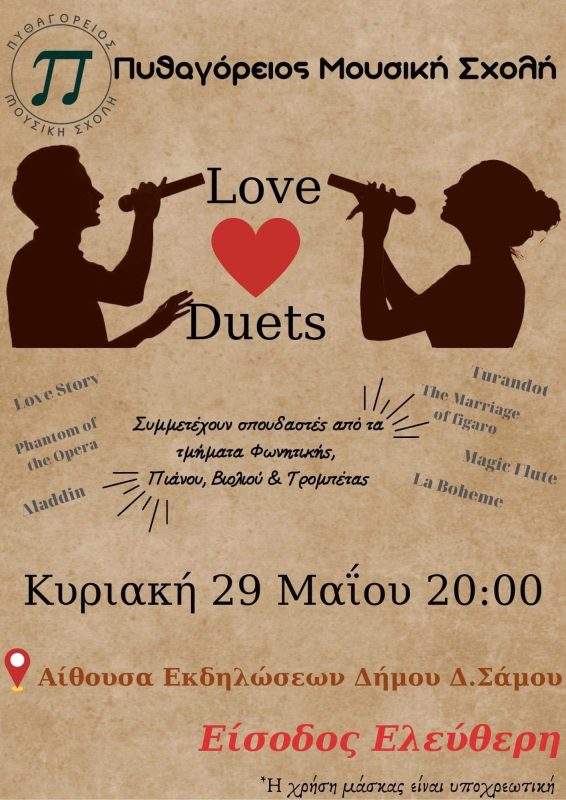 Η Πυθαγόρειος Μουσική Σχολή Σάμου διοργανώνει θεματική συναυλία , με τραγούδια που εξυμνούν την αγάπη! Οι σπουδαστές πρόκειται να ερμηνεύσουν άριες από διάσημες όπερες, όπως : «Μαγικός Αυλός» , «Οι Γάμοι του Φίγκαρο» , «La Boheme», «Tosca», «Τurandot» & περίφημα σύγχρονα τραγούδια από «Alladin», «Το Φάντασμα της Όπερας», «Love Story» κ.α.