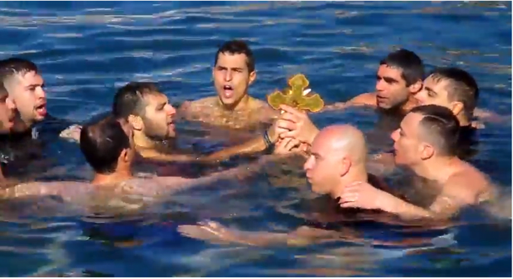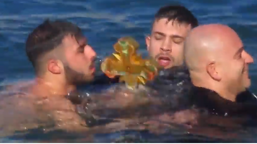 Συγκινητικό ήταν το γεγονός ότι οι νεαροί που βούτηξαν για τον σταυρό μόλις τον έπιασαν έψαλλαν όλοι μαζί τον Εθνικό Ύμνο.