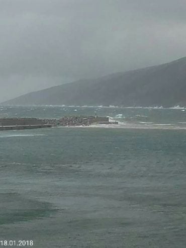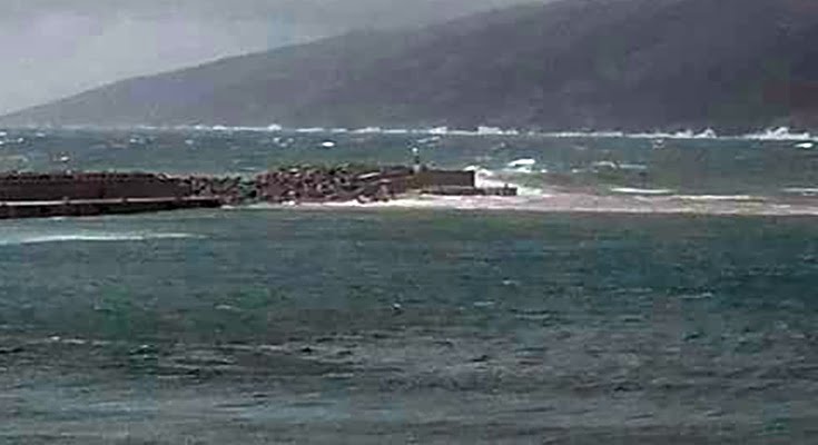 Η σφοδρότατη κακοκαιρία που έπληξε τον Εύδηλο της Ικαρίας σήμερα, προκάλεσε πολλές ζημιές στο τοιχίο στον μόλο.