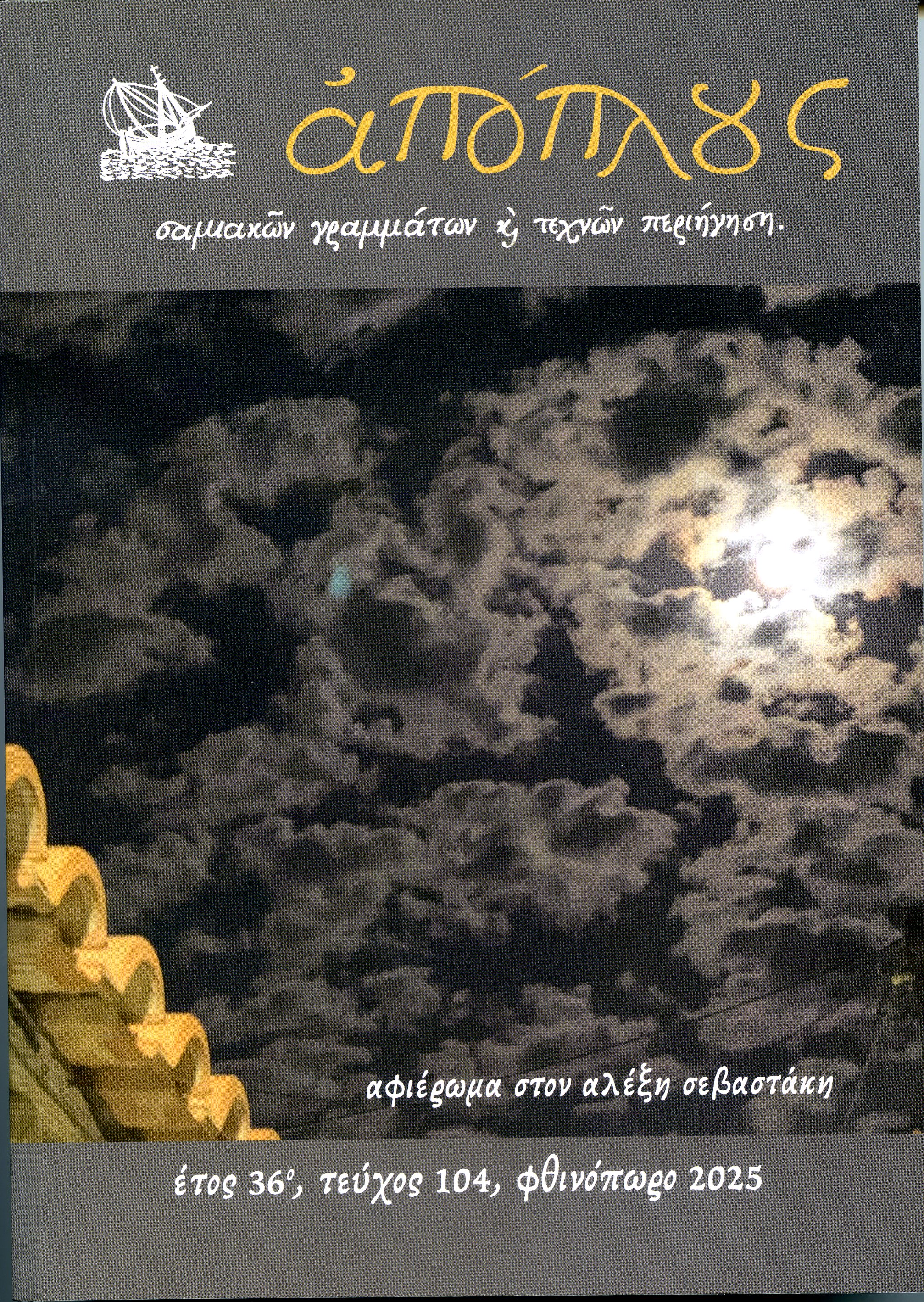 Μαζί με τα παραπάνω παρουσιάζεται και ο δικός του προφορικός λόγος από ραδιοφωνική του συνομιλία με τον αείμνηστο φίλο Θοδωρή Σαρρηγιάννη, το 1990. Το 104ο τεύχος εκτός από αυτό το αφιέρωμα περιλαμβάνει και πολλά άλλα ποιητικά και πεζά κείμενα για τους φίλους της λογοτεχνίας γραμμένα από παλιούς και νέους συνεργάτες του περιοδικού. Η κυκλοφορία του παρόντος τεύχος συμπίπτει με την βράβευση του Απόπλου από την Ακαδημία Αθηνών. Ο Απόπλους ευχαριστεί τα μέλη της Ακαδημίας για την απονομή του βραβείου, τους συνεπιβάτες των ταξιδιών του και τους συνδρομητές του.