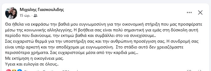 «Θα ήθελα να εκφράσω τη βαθιά μου ευγνωμοσύνη για την οικονομική στήριξη που μας προσφέρατε μέσω της κοινωνικής αλληλεγγύης. Η βοήθειά σας είναι πολύ σημαντική για εμάς στη δύσκολη αυτή περίοδο που διανύουμε, την εκτιμώ βαθιά και συμβάλλει στο να συνεχίσουμε. Σας ευχαριστώ θερμά για την υποστήριξή σας και την ανθρώπινη προσέγγισή σας. Η συνδρομή σας είναι υπέρ αρκετή και την αποδέχομαι με ευγνωμοσύνη. Στο στάδιο αυτό δεν χρειαζόμαστε περισσότερα χρήματα. Σας ευχαριστούμε μέσα από την καρδιά μας. Υγεία και ευλογία σε όλους».
