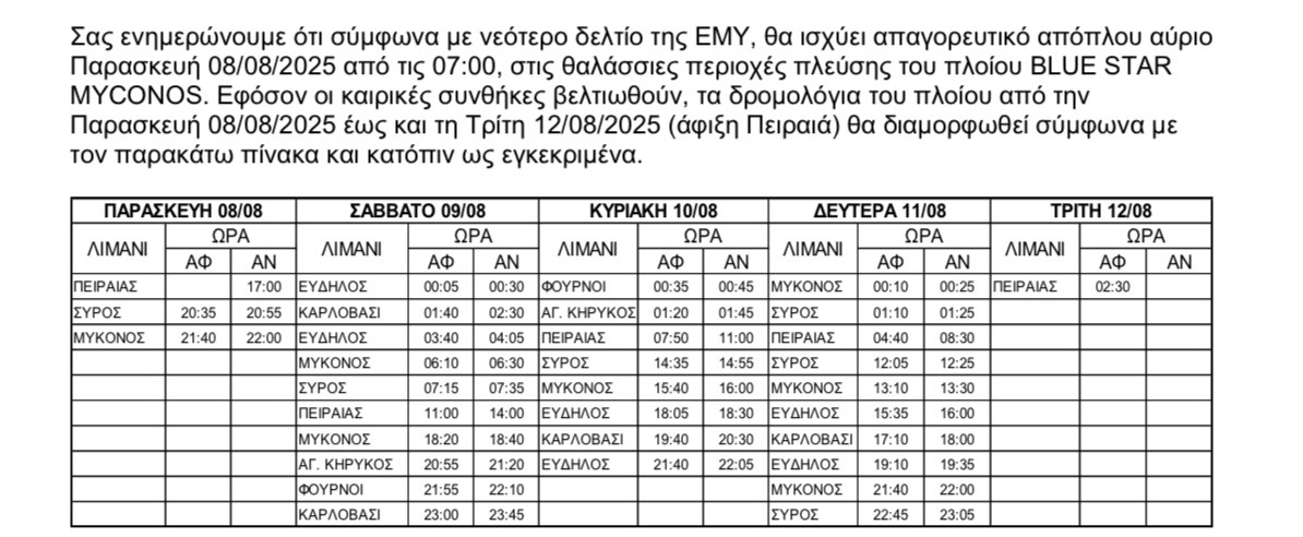 Εφόσον οι καιρικές συνθήκες βελτιωθούν, τα δρομολόγια του πλοίου θα διαμορφωθούν ως εξής, για το διάστημα από σήμερα, Παρασκευή 8 Αυγούστου, έως και την Τρίτη 12 Αυγούστου 2025: