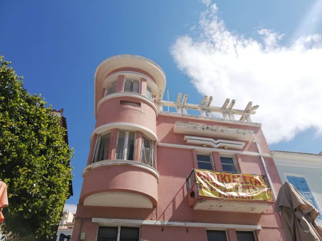 Στη πλατεία Πυθαγόρα. Εκεί κανείς συνάντα το κτίριο της πρώην Εμπορικής Τράπεζας και ακριβώς στα δεξιά δεσπόζει ίσως το πιο όμορφο τριώροφο κτίριο.