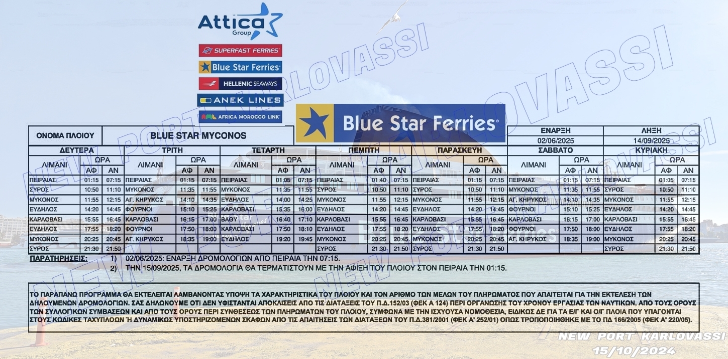 Η Blue Star Ferries ανακοίνωσε τα επίσημα θερινά δρομολόγια του πλοίου Blue Star Myconos, τα οποία θα ισχύουν από τις 2 Ιουνίου έως και τις 14 Σεπτεμβρίου 2025, όπως φαίνεται και στον σχετικό πίνακα που δόθηκε στη δημοσιότητα απο το newportkarlovassi.blogspot.com