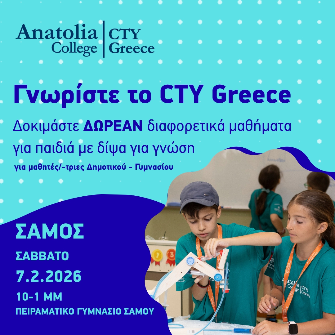 Το Κέντρο για Χαρισματικά και Ταλαντούχα Παιδιά έρχεται για πρώτη φορά στη Σάμο το Σάββατο 7 Φεβρουαρίου 2026 και ανοίγει τις πόρτες του σε μαθητές, γονείς και εκπαιδευτικούς. Στο Πειραματικό Γυμνάσιο Σάμου θα πραγματοποιηθεί δωρεάν Ημέρα Γνωριμίας και παράλληλα επιμορφωτικό εργαστήριο για δασκάλους και καθηγητές.