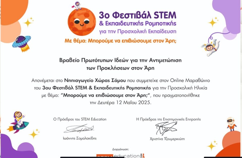 Συγκεκριμένα, στο πλαίσιο του Online Μαραθωνίου του Φεστιβάλ με θέμα “Μπορούμε να επιβιώσουμε στον Άρη;”, ο οποίος πραγματοποιήθηκε τη Δευτέρα 12 Μαΐου 2025, το Νηπιαγωγείο Χώρας τιμήθηκε με το “Βραβείο Πρωτότυπων Ιδεών για την Αντιμετώπιση των Προκλήσεων στον Άρη”.