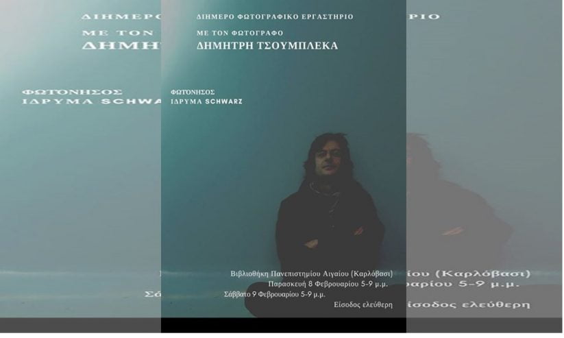 Η Φωτογραφική Ομάδα Φωτόνησος σε συνεργασία με το Ίδρυμα Schwarz διοργανώνει διήμερο φωτογραφικό εργαστήριο με τον φωτογράφο Δημήτρη Τσουμπλέκα. Το εργαστήριο θα πραγματοποιηθεί στη Βιβλιοθήκη του Πανεπιστημίου Αιγαίου στο Καρλόβασι, την Παρασκευή 8 Φεβρουαρίου (5-9 μ. μ.) και το Σάββατο 9 Φεβρουαρίου (5-9 μ. μ.) και απευθύνεται σε όλους όσοι ενδιαφέρονται για τη φωτογραφία.