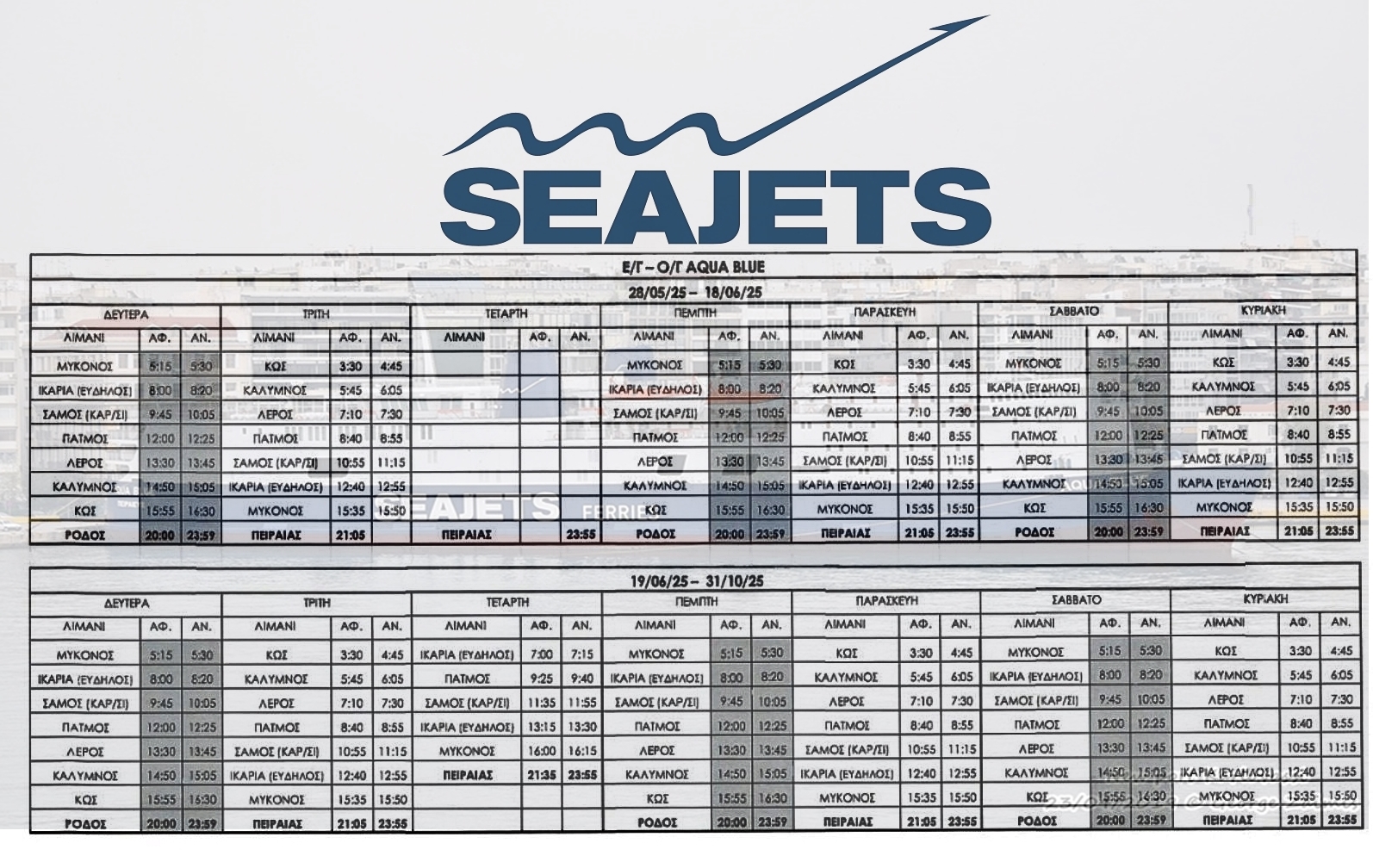 Η SEAJET ανακοίνωσε το πρόγραμμα δρομολογίων του πλοίου AQUA BLUE για την περίοδο από 28 Μαΐου έως και 31 Οκτωβρίου 2025. Το πλοίο θα συνδέει τον Πειραιά με τη Ρόδο, εξυπηρετώντας και ενδιάμεσους δημοφιλείς προορισμούς.