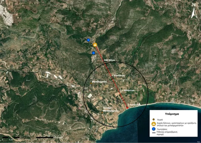 Οι ξύλινοι στύλοι, εμποτισμένοι με την καρκινογόνο ουσία κρεόζωτο και οι μετασχηματιστές, που περιέχουν πολυχλωριωμένα διφαινύλια (PCBs), έχουν συσσωρευτεί και αφεθεί εκτεθειμένοι απευθείας πάνω στο έδαφος, χωρίς τα αυστηρά μέτρα προστασίας που ορίζει ο νόμος. Πρέπει να επισημανθεί πως το κρεόζωτο εδώ και δεκαετίες έχει χαρακτηριστεί από τον Παγκόσμιο Οργανισμό Υγείας ως ισχυρά τοξική και καρκινογόνος ουσία. Η παράνομη εναπόθεση αυτών των τοξικών υλικων δίπλα σε γεωτρήσεις πόσιμου νερού αποτελεί κραυγαλέα παραβίαση της εθνικής και ευρωπαϊκής νομοθεσίας, καθώς θέτει σε άμεσο κίνδυνο την υγεία των κατοίκων της Σάμου. Μάλιστα, έχουν εναποτεθεί πάνω σε απορροή που οδηγεί στα πηγάδια και τις καλλιεργήσιμες εκτάσεις του Μεσοκάμπου. Η διάχυση αυτών των τοξικών ουσιών στο περιβάλλον, στο έδαφος, στα υπόγεια ύδατα, στη χλωρίδα και στην πανίδα έχει μακροχρόνιες και μη αναστρέψιμες συνέπειες.