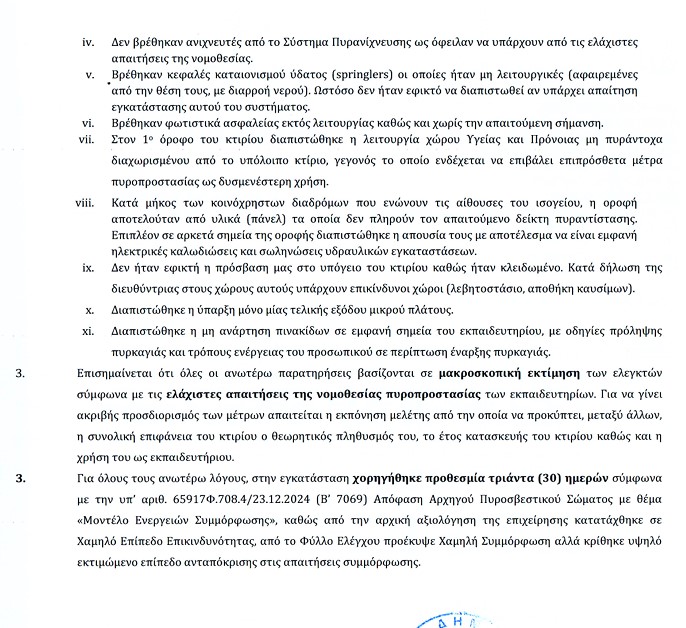 Η Πυροσβεστική σημειώνει ότι οι παρατηρήσεις βασίζονται σε μακροσκοπική εκτίμηση και απαιτείται εκπόνηση πλήρους μελέτης για τον ακριβή καθορισμό των μέτρων. Στην εγκατάσταση δόθηκε προθεσμία τριάντα ημερών για συμμόρφωση.