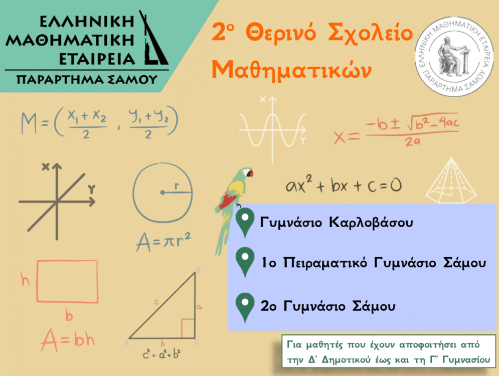 Η Ελληνική Μαθηματική Εταιρεία, Παράρτημα Σάμου, ανακοινώνει την έναρξη των εργασιών του 2ου Θερινού Σχολείου Μαθηματικών, με μια ξεχωριστή εκδήλωση που θα πραγματοποιηθεί τη Δευτέρα 30 Ιουνίου, στις 20:15. Ο χώρος διεξαγωγής είναι το προαύλιο του Ιστορικού Αρχείου Σάμου (ΓΑΚ Σάμου), στο Βαθύ.