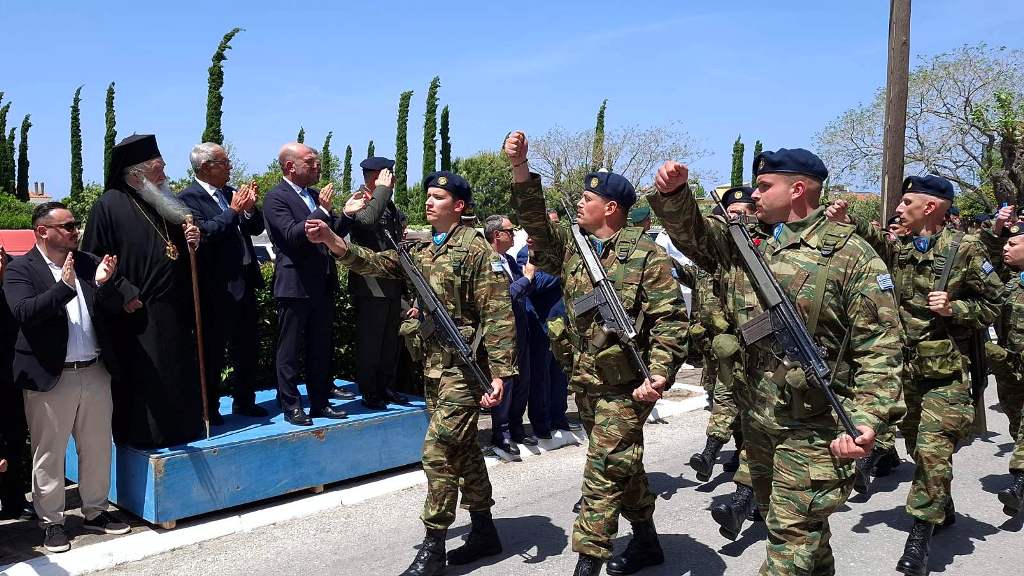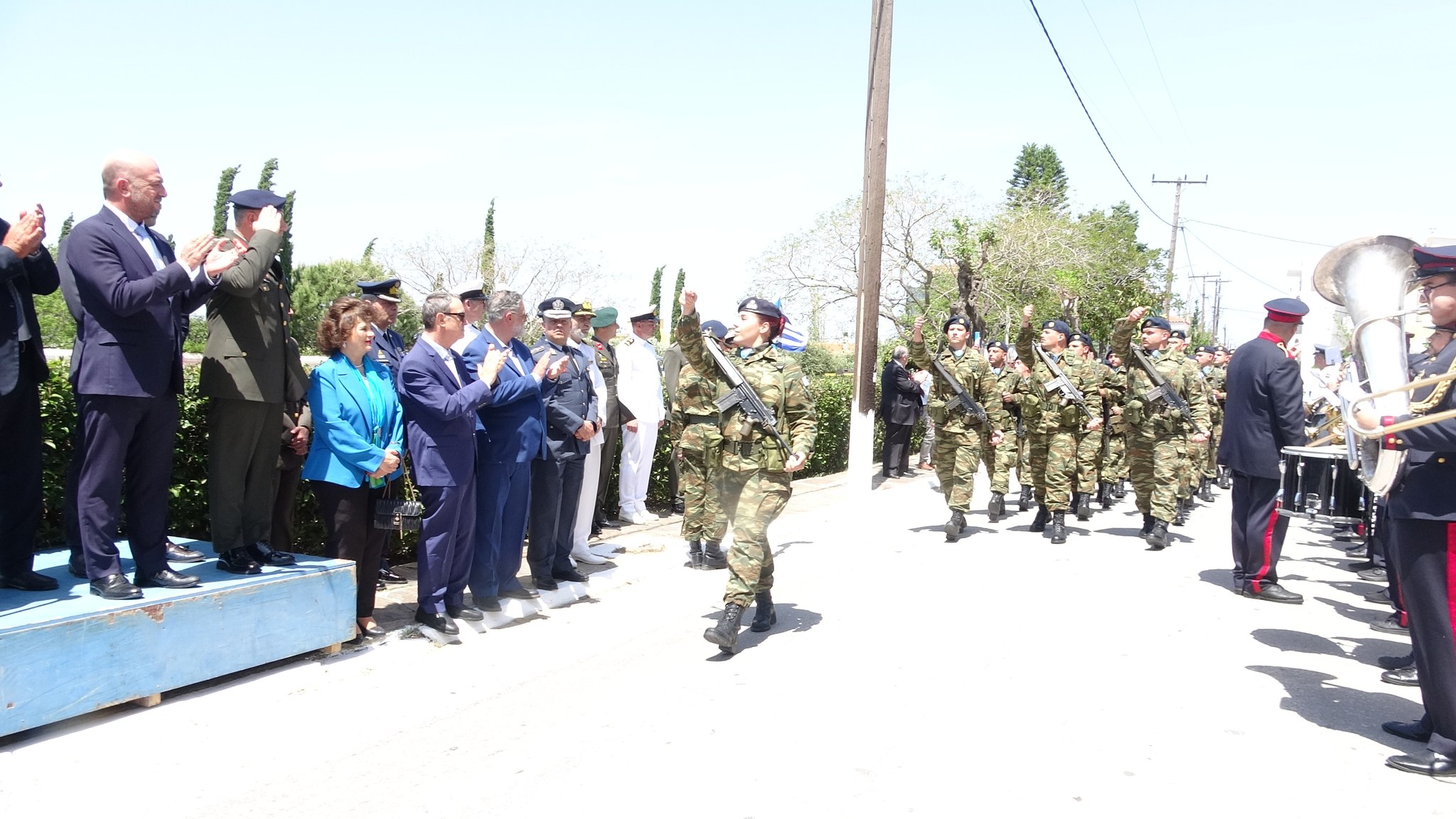 Στη συνέχεια, οι παρευρισκόμενοι παρακολούθησαν από την εξέδρα την καθιερωμένη μαθητική και στρατιωτική παρέλαση, η οποία καταχειροκροτήθηκε.