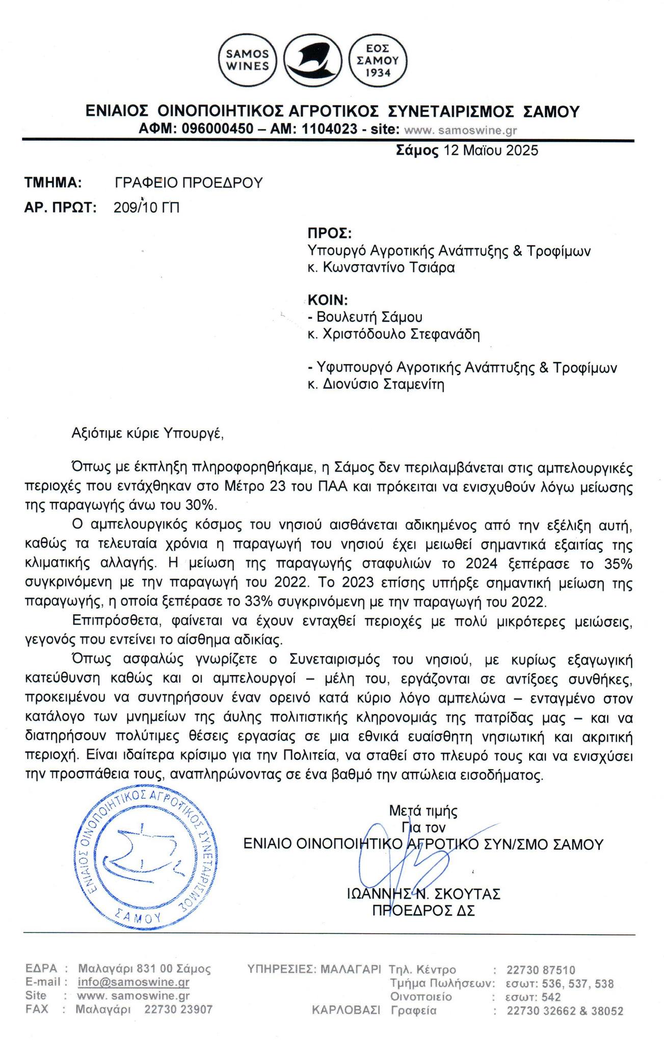 Ο ΕΟΣΣΑΜΟΥ, δια του Προέδρου του κ. Ιωάννη Σκούτα, είχε αποστείλει έγγραφο προς τον Υπουργό Αγροτικής Ανάπτυξης & Τροφίμων, κ. Κώστα Τσιάρα, εκφράζοντας την ανησυχία του για τη μη συμπερίληψη της Σάμου στο συγκεκριμένο μέτρο.