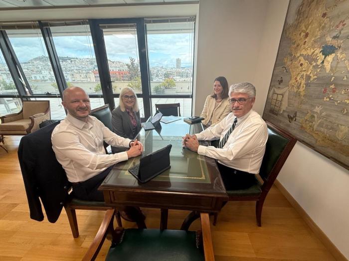 Στιγμιότυπο από τη συνάντηση του γ.γ. ΕΟΤ, Ανδρέα Φιορεντίνου (δεξιά), στα γραφεία του οργανισμού, με τα στελέχη της JET2, Jacob Bramley (πρώτος από αριστερά), την Janice Mather (δεύτερη από αριστερά), και με τη συμμετοχή της διευθύντριας Τουριστικής Προβολής ΕΟΤ, Ελένης Μητράκη.