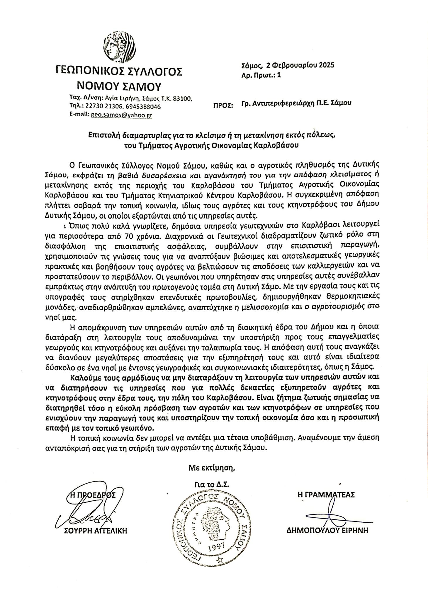 Γεωπονικός Σύλλογος Νομού Σάμου και ο αγροτικός πληθυσμός της Δυτικής Σάμου εκφράζουν τη βαθιά δυσαρέσκεια τους για την απόφαση περί κλεισίματος ή μετακίνησης εκτός του Καρλοβάσου του Τμήματος Αγροτικής Οικονομίας Καρλοβάσου και του Τμήματος Κτηνιατρικού Κέντρου Καρλοβάσου.
