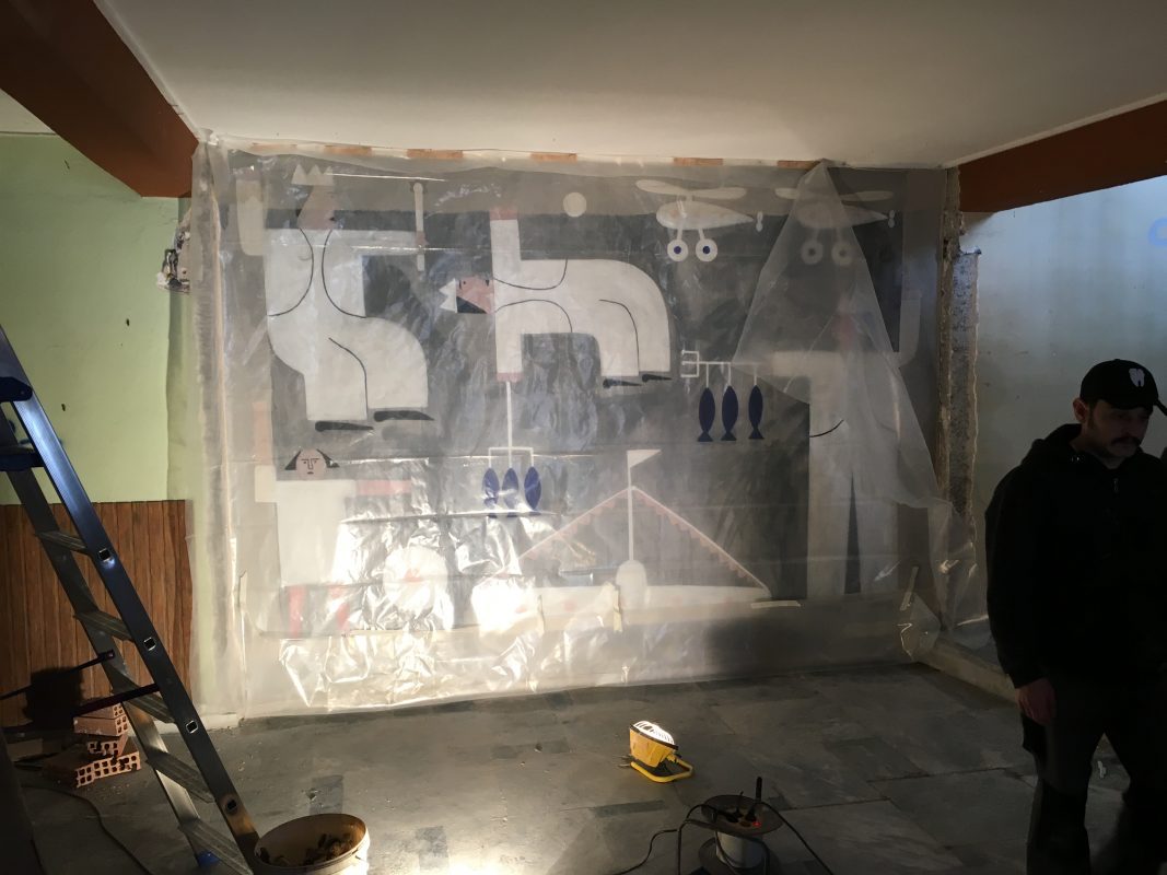 Η προστασία των έργων είναι απαραίτητη λόγω των δυναμικών εργασιών που θα γίνουν στο κτήριο. Όπως ανέφερε η κα Πολυχρονιάδου, έχει ήδη καλυφθεί η τοιχογραφία, τοπικά, με γιαπωνέζικο χαρτί και περιμετρικά με γάζα. Γίνεται προσπάθεια, ώστε να μην υπάρξουν μικρορωγμές ή μεγαλύτερες ρωγμές στο έργο.