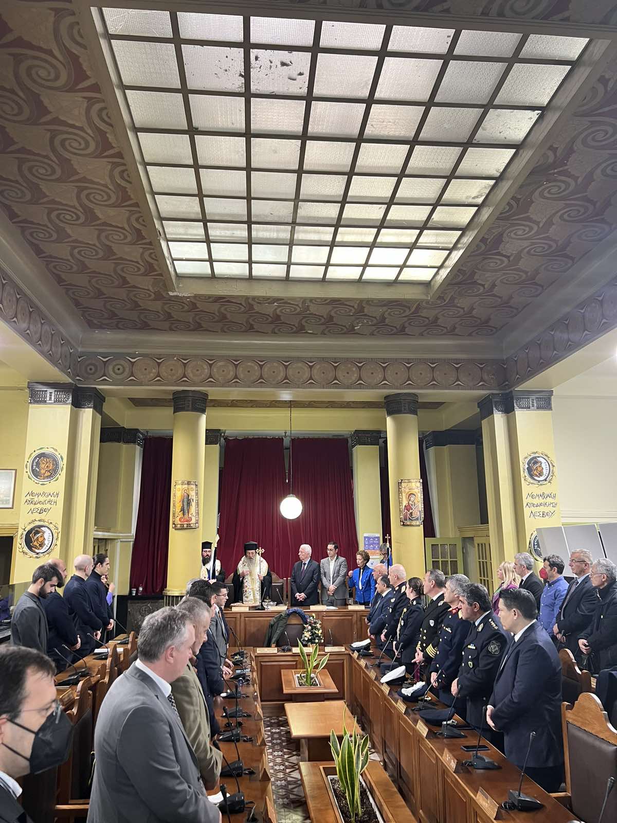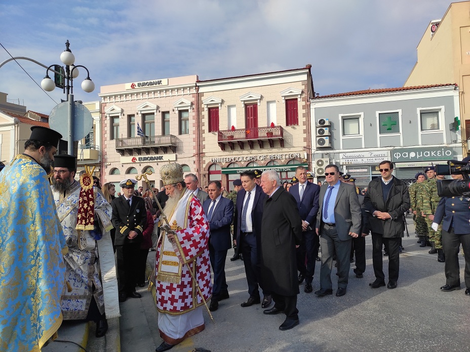 Το πρωί παρακολούθησε την πανηγυρική Θεία Λειτουργία των Θεοφανείων στον Ι.Ν Αγίου Αθανασίου- Μητροπόλεως Μυτιλήνης Χοροστατούντος του Σεβασμιότατου Μητροπολίτη Μυτιλήνης-Ερεσού και Πλωμαρίου κ.κ. Ιακώβου, την λιτανία και την τελετή Αγιασμού των Υδάτων και ρίψης του Σταυρού στη θάλασσα.