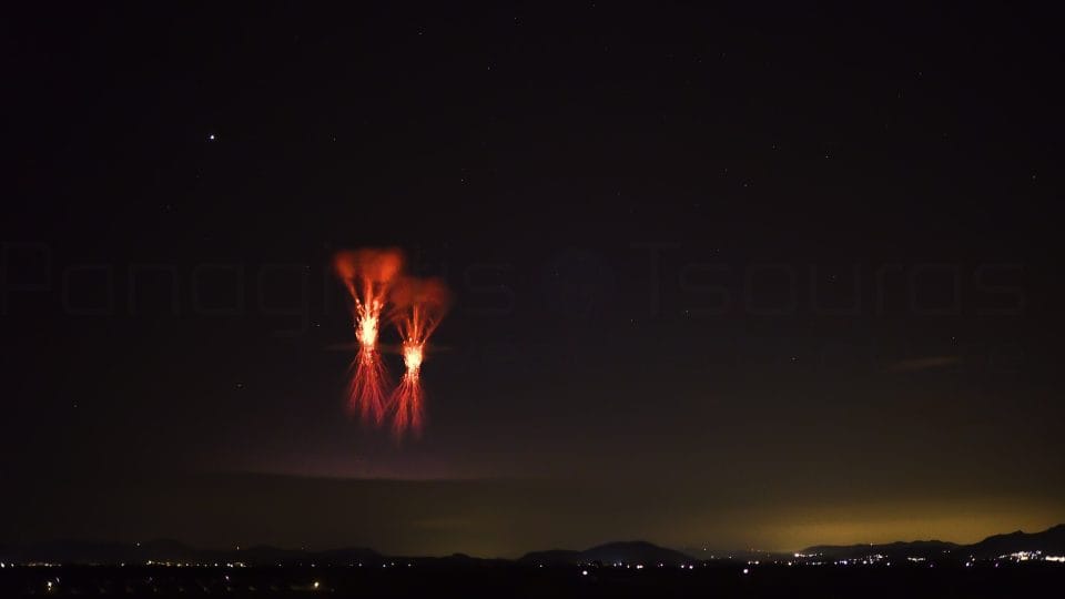 Ένα διπλό red sprite προκλήθηκε από την καταιγίδα στο Αιγαίο, χθες νωρίς το βράδυ. Ο μητρικός κεραυνός που τα δημιούργησε, εντοπίστηκε στην Ικαρία.
