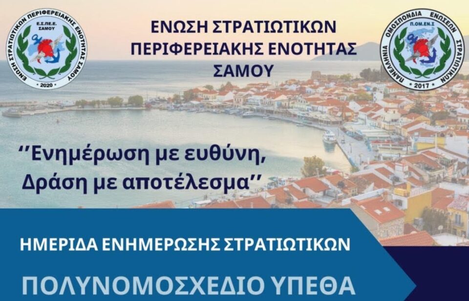 Η Ένωση Στρατιωτικών Περιφερειακής Ενότητας Σάμου διοργανώνει ενημερωτική ημερίδα το Σάββατο 13 Δεκεμβρίου 2025, στις 18:00, στο Δημαρχιακό Μέγαρο Βαθέος, με κεντρικό θέμα τα υπηρεσιακά και θεσμικά ζητήματα των εν ενεργεία στελεχών. Η παρουσία υψηλόβαθμων εκπροσώπων της ΠΟΜΕΝΣ δίνει στη συνάντηση ιδιαίτερη βαρύτητα, καθώς το νησί υποδέχεται ξανά την Ομοσπονδία, με στελέχη που επιστρέφουν αλλά και νέες συμμετοχές.
