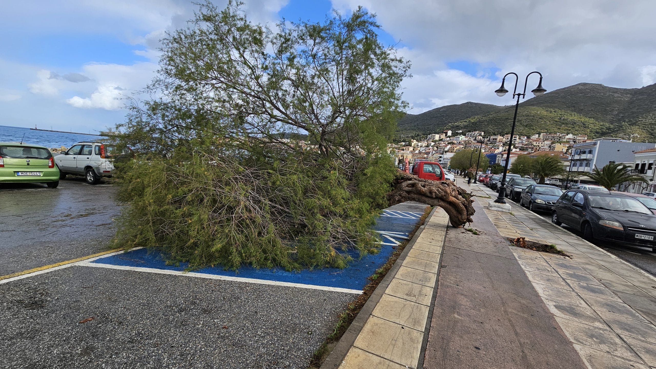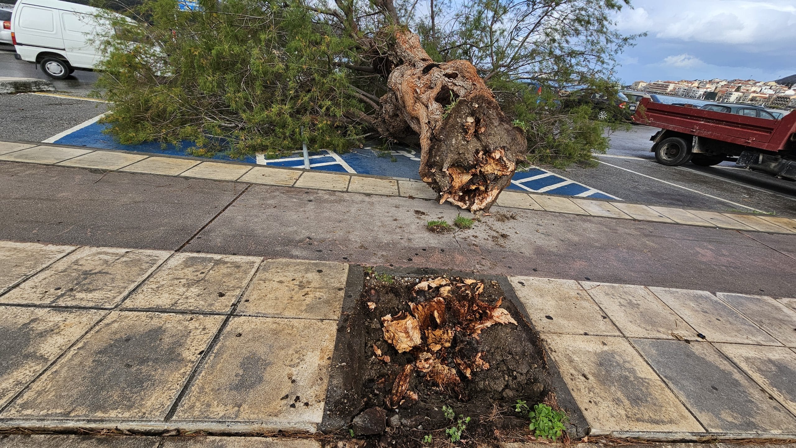 Στο πάρκινγκ σούπερ μάρκετ, μεταλλικές κατασκευές σκίασης αποκολλήθηκαν και κατέρρευσαν, ενώ στο Γεφυράκι ένα αλμυρίκι ξεριζώθηκε και έπεσε σε χώρο στάθμευσης χωρίς να υπάρξουν τραυματισμοί.