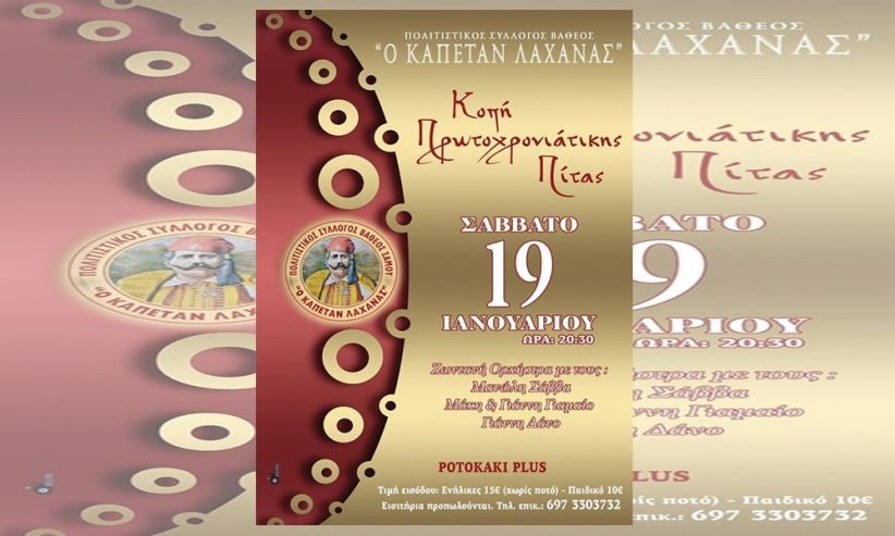 Ο Πολιτιστικός Σύλλογος Βαθέος Σάμου “Ο Καπετάν Λαχανάς ” διοργανώνει χορό για την κοπή της πρωτοχρονιάτικης πίτας του στο εστιατόριο “Potokaki Plus”, το Σάββατο 19 Ιανουαρίου στις 20.30.