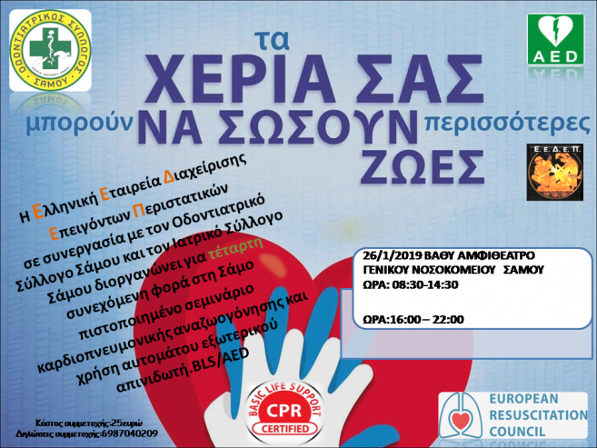 Πιστοποιημένα Σεμινάρια Καρδιοαναπνευστικής Αναζωογόννησης και Χρήσης Αυτόματου Εξωτερικού Απινιδωτή από την Ελληνική Εταιρεία Διαχείρισης Επειγόντων Περιστατικών σε συνεργασία με τον Ιατρικό και Οδοντιατρικό Σύλλογο Σάμου, θα πραγματοποιηθούν το Σάββατο 26 Ιανουαρίου στο Αμφιθέατρο του Γενικού Νοσοκομείου Σάμου.