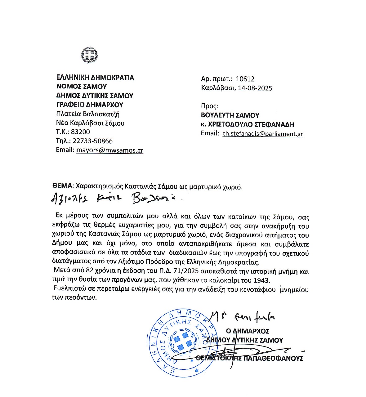 Με έκπληξη παρακολουθούμε το τελευταίο διάστημα την ανταλλαγή «βλημάτων» μεταξύ Δημοτικών παραγόντων της Δυτικής Σάμου και του Βουλευτή Σάμου για την οικειοποίηση του έργου αναγνώρισης του χωριού Καστανιά ως “Μαρτυρικό χωριό”, 82 χρόνια μετά το φασιστικό έγκλημα του 1943.