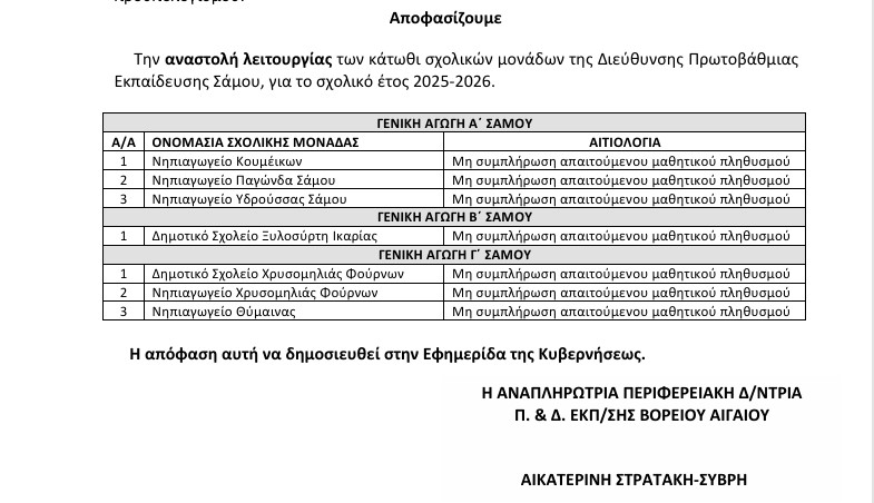 Η απόφαση υπογράφεται από την αναπληρώτρια περιφερειακή διευθύντρια Π. & Δ. Εκπαίδευσης Βορείου Αιγαίου, Αικατερίνη Στρατάκη-Συβρή, και έχει αναρτηθεί στη «Διαύγεια».