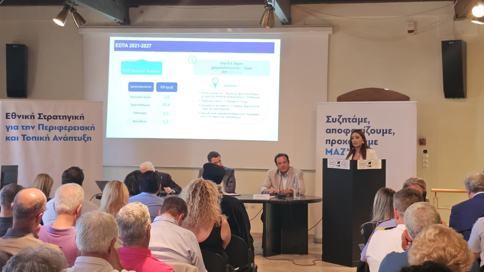 Το πρωί της Πέμπτης, στο Μουσείο Οίνου στο Μαλαγάρι Σάμου, πραγματοποιήθηκε η παρουσίαση του Τοπικού Σχεδίου Ανάπτυξης της Περιφερειακής Ενότητας Σάμου, στο πλαίσιο της Εθνικής Στρατηγικής για την Τοπική Ανάπτυξη. Στην εκδήλωση συμμετείχαν κυβερνητικά στελέχη, όπως οι Λ. Μενδώνη, Υπουργός Πολιτισμού, Θ. Κοντογεώργης, Υφυπουργός στον Πρωθυπουργό, Σ. Βολουδάκης, Υφυπουργός Μετανάστευσης & Ασύλου, Κ. Κατσαφάδος, Υφυπουργός Κλιματικής Κρίσης & Πολιτικής Προστασίας, καθώς και άλλοι Γενικοί Γραμματείς αρμόδιοι για τις δημόσιες επενδύσεις, στρατηγικό και χωρικό σχεδιασμό, αγροτική πολιτική, νησιωτική πολιτική, τουριστική ανάπτυξη και αποκατάσταση φυσικών καταστροφών.