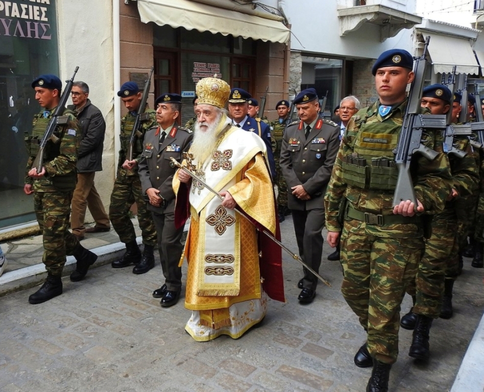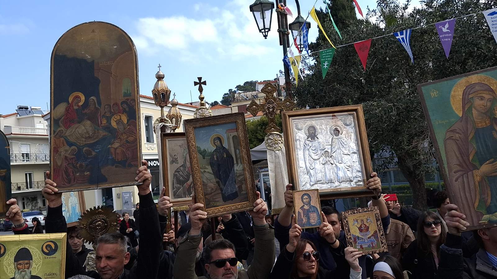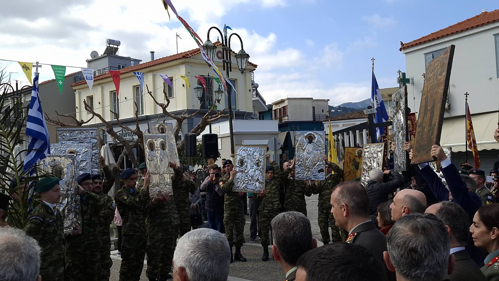 Κατά τη διάρκεια του ψαλμού «Τις Θεός μέγας…», δεκάδες νέοι εθελοντές και στρατιώτες ύψωσαν τις ιερές εικόνες και τα λάβαρα, υπό τους θριαμβευτικούς ήχους της Φιλαρμονικής «Κλεάνθης ο Σάμιος», εκφράζοντας την αφοσίωσή τους στην Ορθοδοξία.