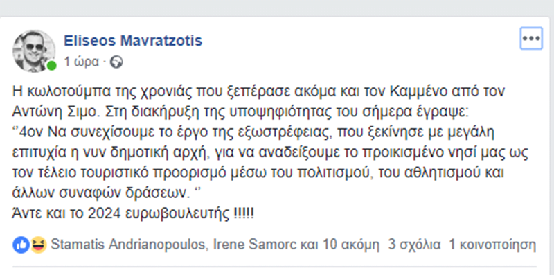 Αργότερα το απόγευμα με ανάρτηση του στο Facebook, ο δημοτικός Σύμβουλος Σάμου, Ελισσαίος Μαυρατζώτης, με αφορμή σημείο της διακήρυξης της υποψηφιότητας του κ. Σίμου, το χαρακτήρισε ως “κωλοτούμπα της χρονιάς που ξεπέρασε ακόμα και τον Πανό Καμμένο”.