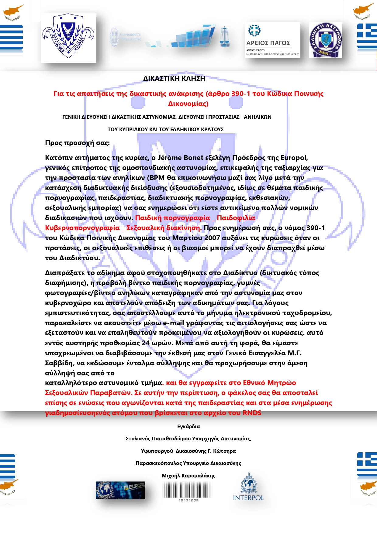Παράλληλα, στην προσπάθειά τους να προσδώσουν «αληθοφάνεια» στη σχετική επιστολή χρησιμοποιούν τα λογότυπα της Ελληνικής Αστυνομίας, της Αστυνομίας Κύπρου, του Υπουργείου Δικαιοσύνης, καθώς και δικαστικών Αρχών και Αρχών επιβολής του Νόμου.