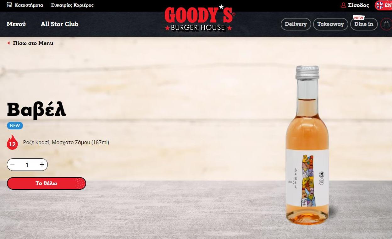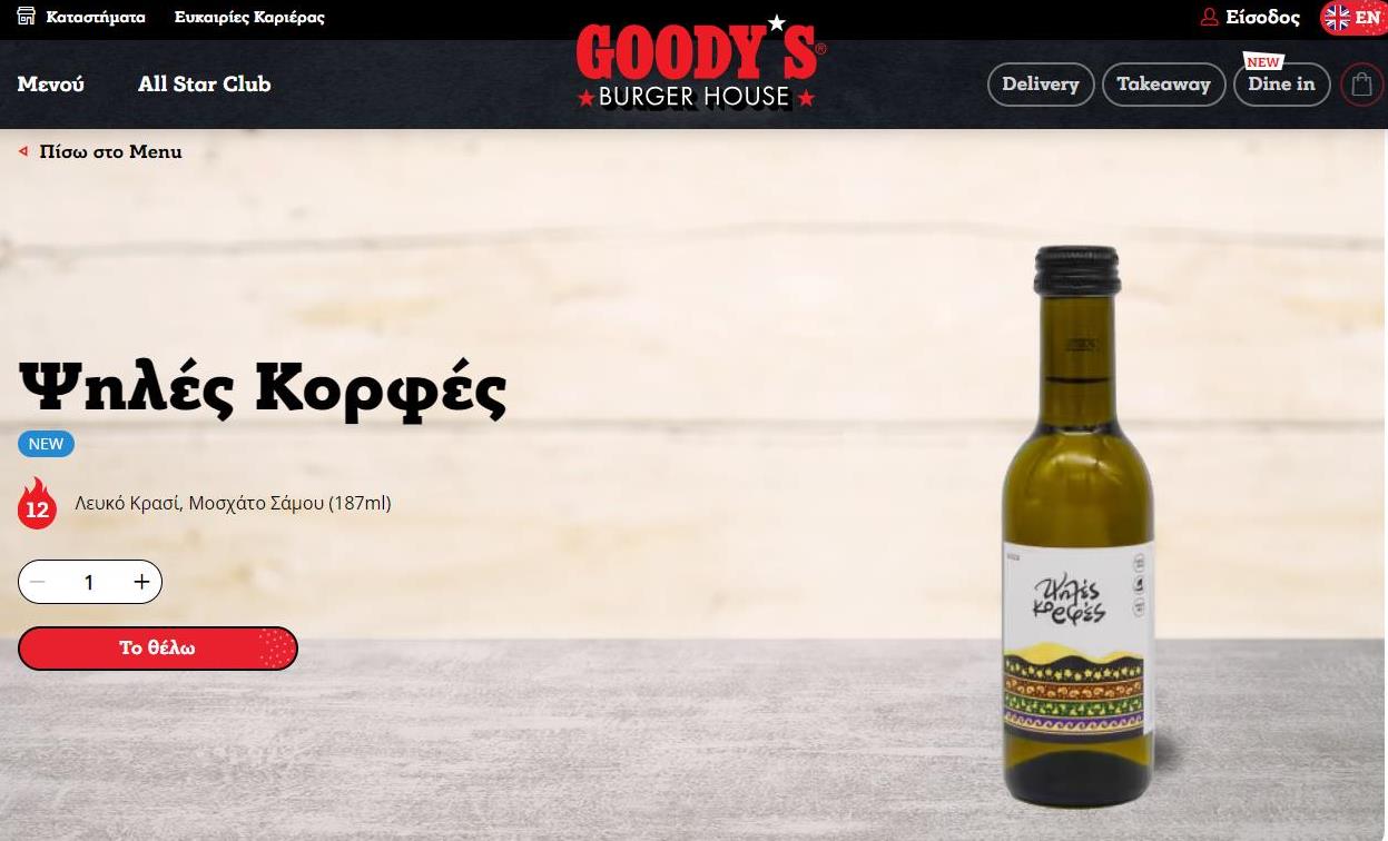 Με το σύνθημα «το θέλω», η επιλογή κατανάλωσης ποιοτικού εμφιαλωμένου κρασιού στην αλυσίδα των Goody’s, αποτελεί μια σοβαρή επικοινωνιακή επένδυση καθώς «μαθαίνει» το καταναλωτικό κοινό στην άρνηση του «χύμα» κρασιού χωρίς ταυτότητα, ποιότητα και προέλευση.