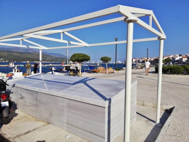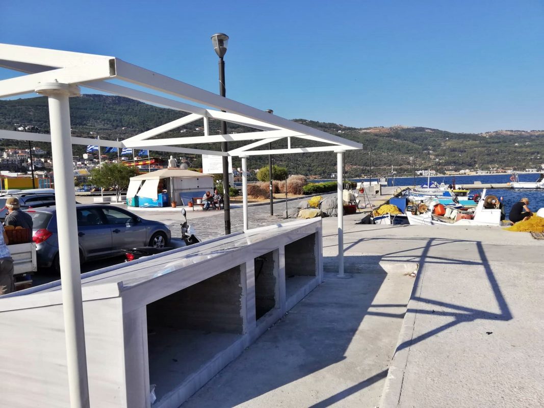Το μόνο που μένει να γίνει είναι η τοποθέτηση της τέντας στο πάνω μέρος της κατασκευής απο τον ανάδοχο εργολάβο. Το έργο χρηματοδοτήθηκε από το Λιμενικό Ταμείο Σάμου και διαθέτει για τις ανάγκες των ψαράδων, παροχή νερού και την απαιτούμενη αποχέτευση.
