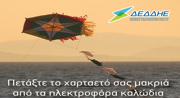 Ο Διαχειριστής Ελληνικού Δικτύου Διανομής Ηλεκτρικής Ενέργειας (ΔΕΔΔΗΕ) σας συμβουλεύει να μην πετάτε το χαρταετό σας κοντά σε ηλεκτροφόρα καλώδια, καθώς υπάρχει σοβαρός κίνδυνος ηλεκτροπληξίας για εσάς και διακοπής της παροχήςρεύματος στη γύρω περιοχή.